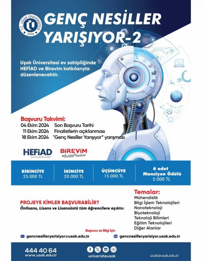 Uşak Üniversitesi tarafından 18 Ekim 2024 tarihinde düzenlenecek olan "2. Genç Nesiller Yarışıyor" proje yarışması ile ilgili afiş ektedir.