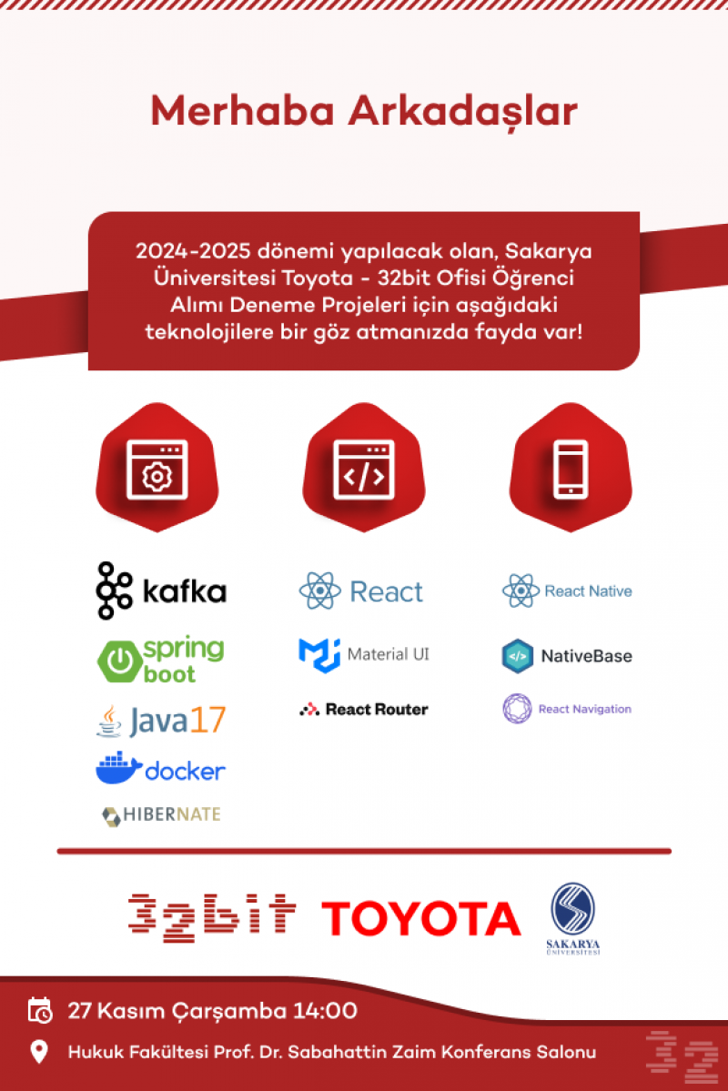 Merhaba Arkadaşlar! 2024-2025 döneminde yapılacak olan Sakarya Üniversitesi Toyota - 32bit Ofisi öğrenci alım süreci için teknoloji projelerine katılmak isteyenler, bu etkinlik tam size göre! İlgili teknolojiler arasında Kafka, React, Spring Boot, Java 17, Docker gibi araçlar yer almakta. Daha fazlasını öğrenmek ve projelere adım atmak için buluşuyoruz!