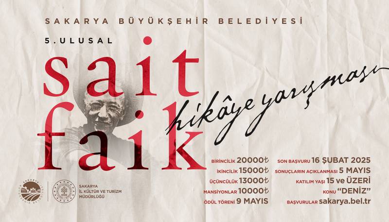 Adapazarı'nda 1906 yılında dünyaya gelen, öykücülüğü ile Türk Edebiyatında önemli bir yer edinmiş olan Sait Faik ABASIYANIK'ın anısını yaşatmak, hikâye alanında yapılan çalışmaları desteklemek ve Sait Faik'i genç kuşaklara tanıtmak amacıyla İl Kültür ve Turizm Müdürlüğü Kültür İşleri Şube Müdürlüğü ile Sakarya Büyükşehir Belediyesi işbirliğinde "5. Ulusal Sait Faik Hikâye Yarışması" düzenlenmektedir. Konusu "Deniz" olan yarışmanın son başvuru tarihi 16 Şubat 2025 Pazar günü olup, yarışmanın detaylı bilgilerine www.sakarya.bel.tr adresinden ulaşılabilmektedir